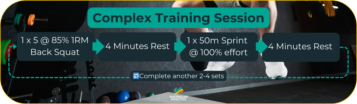 The high intensity resistance exercise is performed first, followed by the plyometric power exercise. For example, a session may incorporate a back squat at 95% of an athletes maximum weight, followed by 5 box jumps.