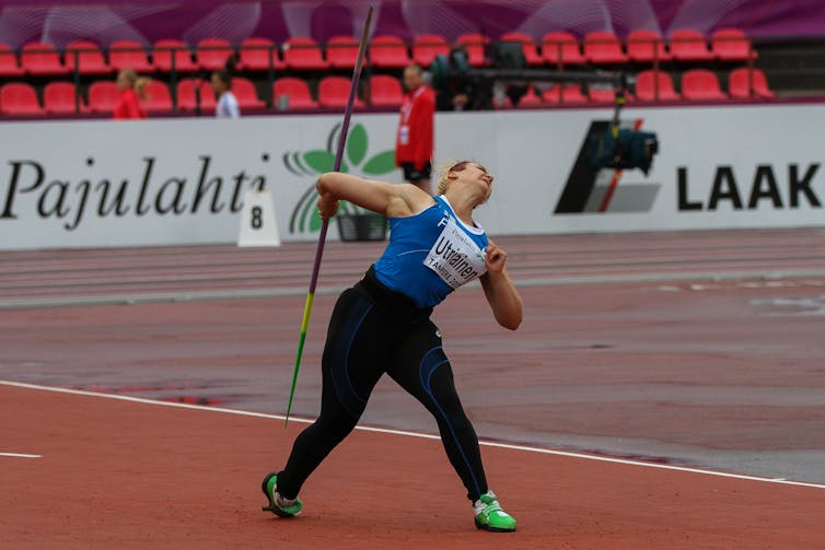 3. Delivery and recovery: once the front foot is down, the motion of the upper body begins. As one joint – such as the hip – reaches the end of its range of motion and decelerates, the next joint – the shoulder, then elbow and finally the javelin – is rapidly accelerated.